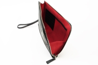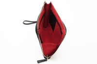 取り外し可能なストラップもリザードを使用することでさりげない高級感をプラス。中は発色のいい赤のスエードを使用することで表面の迷彩ブラック柄とのマッチングが映える仕上がりに。