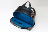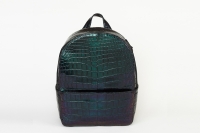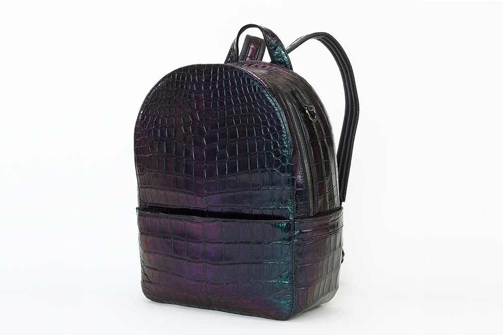 暗い場所では黒色ですが、光が当たる角度によってグリーンや紫に見えます。とても柔らかい仕上がりになっており、背中に当たる面には通気性のよいメッシュを使用しております。
