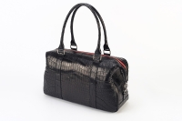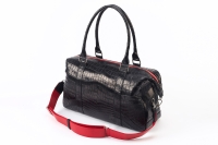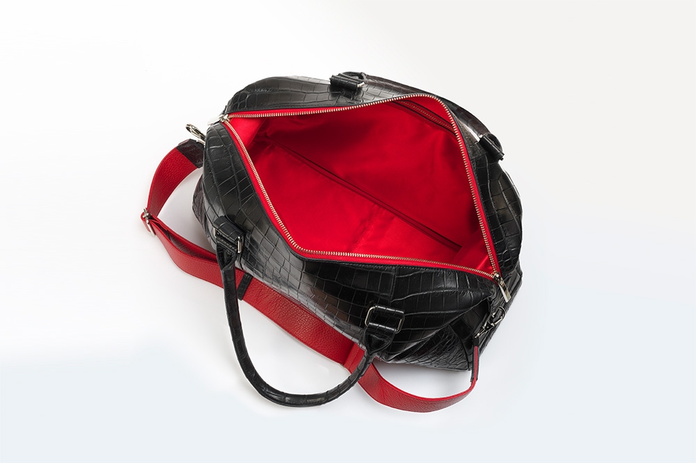 ファスナーテープ・裏地・ショルダーストラップにビビットな赤をあしらい、黒のクロコとの相性は抜群です。